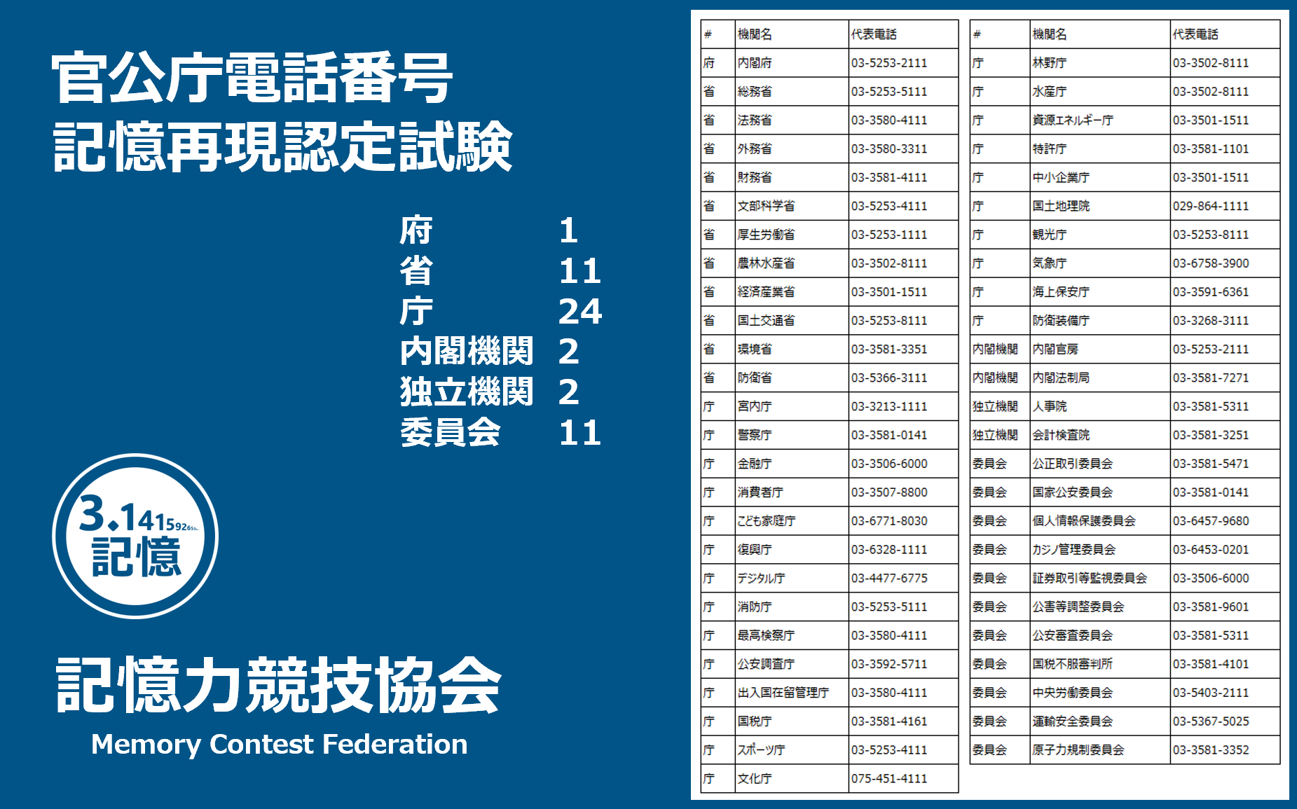 日本の官公庁の代表電話番号を記憶し再現できるか否かを確認する試験です。